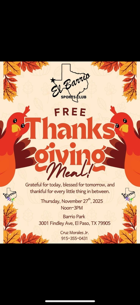 Hi Douglass Families! 🦃🍁 El Barrio Sports Club is hosting a FREE Thanksgiving Meal for the community! 📅 Thursday, November 27, 2025 ⏰ Noon–3 PM 📍 Barrio Park – 3001 Findley Ave, El Paso, TX 79905 For more info, contact: Cruz Morales Jr. – 915-355-0431 Hola familias de Douglass 🦃🍁 El Barrio Sports Club está ofreciendo una Comida GRATUITA de Acción de Gracias para la comunidad. 📅 Jueves, 27 de noviembre de 2025 ⏰ 12 PM – 3 PM 📍 Barrio Park – 3001 Findley Ave, El Paso, TX 79905 Para más información: Cruz Morales Jr. – 915-355-0431