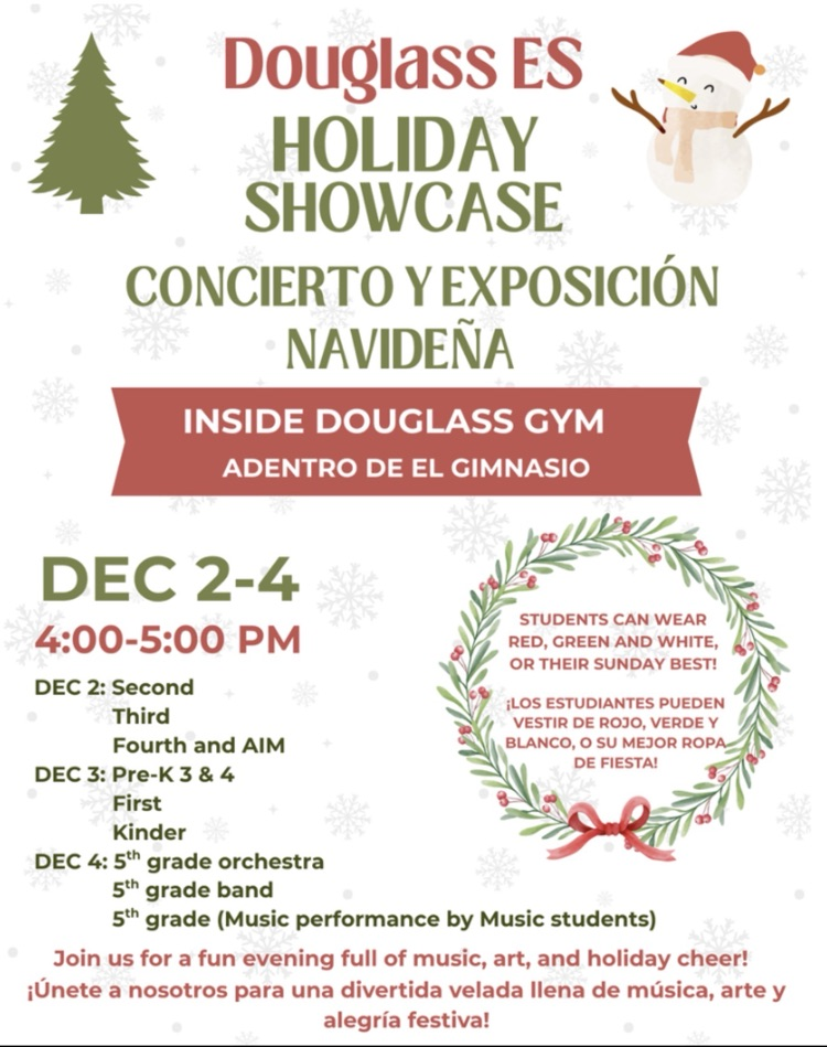 Douglass Holiday Showcase begins on Tuesday! Check for your student's performance day and time.