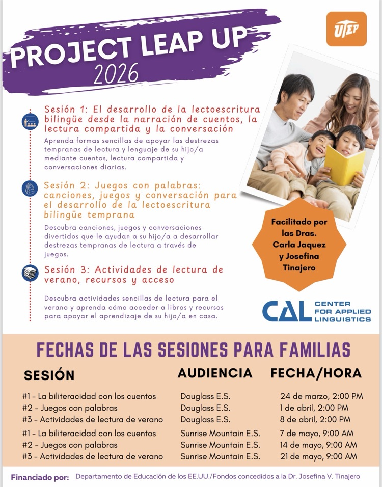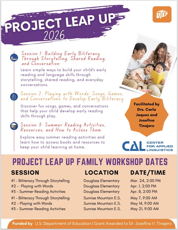 Están invitados a acompañarnos hoy a las 2:00 PM en Douglass Elementary para un taller familiar de Project LEAP UP con UTEP. Aprenderán maneras sencillas de apoyar la lectura y el desarrollo del lenguaje de sus hijos en casa. ¡Los esperamos!